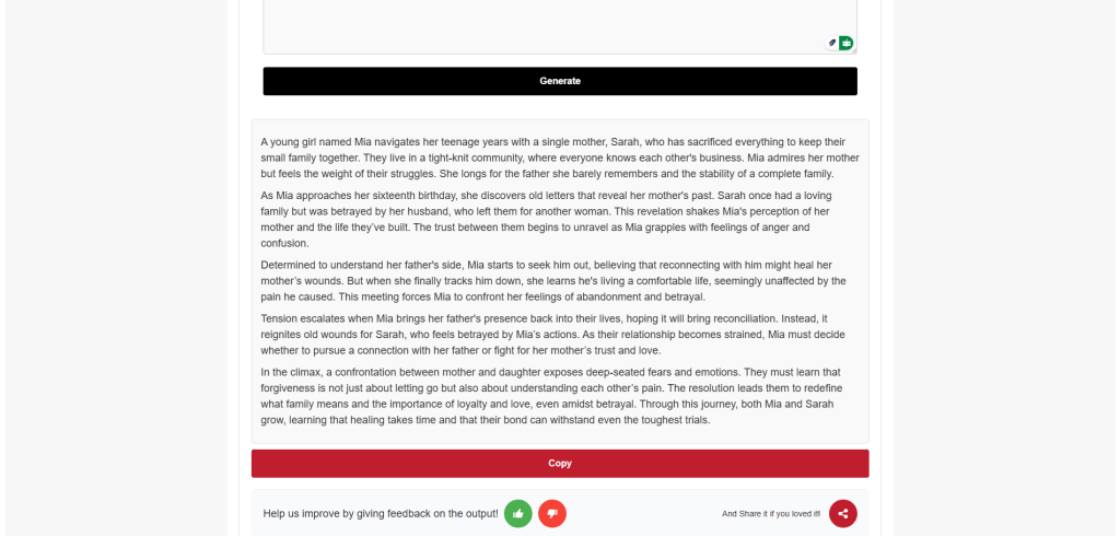 After providing these details, the story idea generator processes your choices and quickly presents you with fresh drama story ideas. You can expect various creative drama story ideas, ranging from detailed plot ideas for drama to concise writing prompts for drama. The goal is to provide you with a solid foundation or a complete concept to begin your writing.