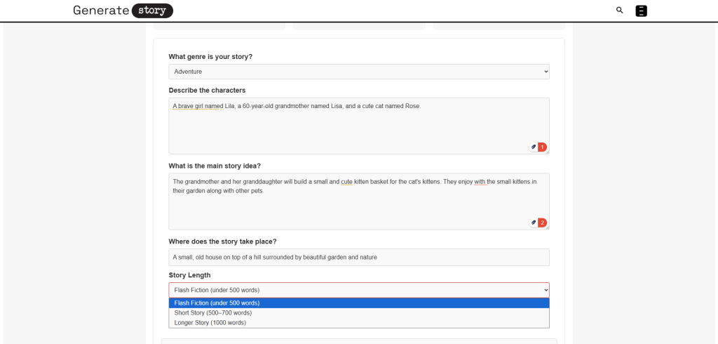 Finally, you select your desired story length. You can choose from “Flash Fiction (under 500 words),” “Short Story (500–700 words),” or “Longer Story (1000 words).” This helps to define the scope of the output and decide the length of the story.