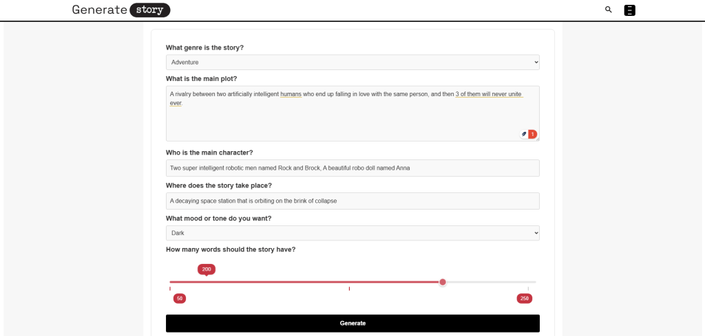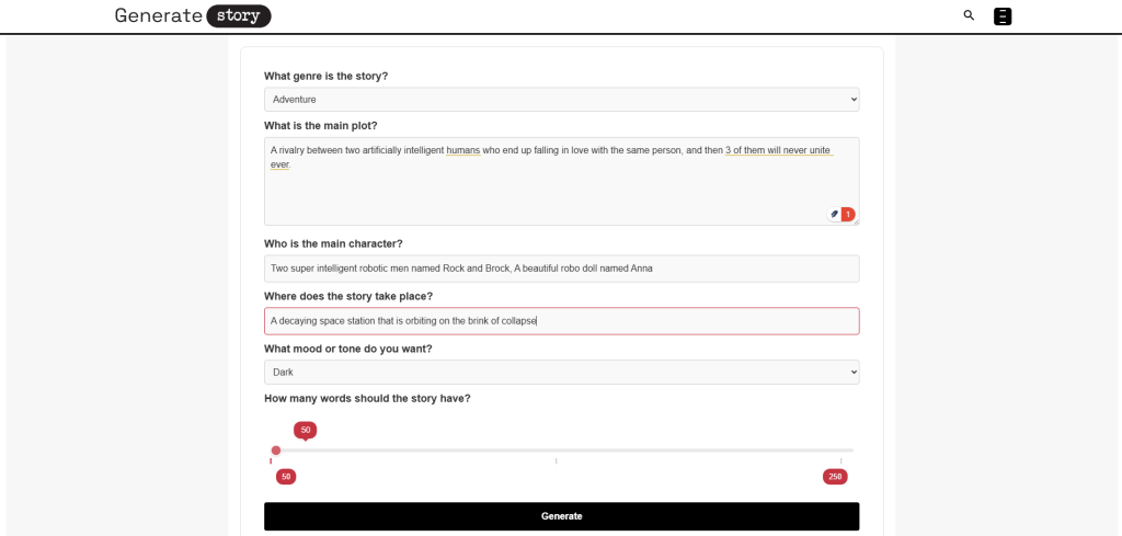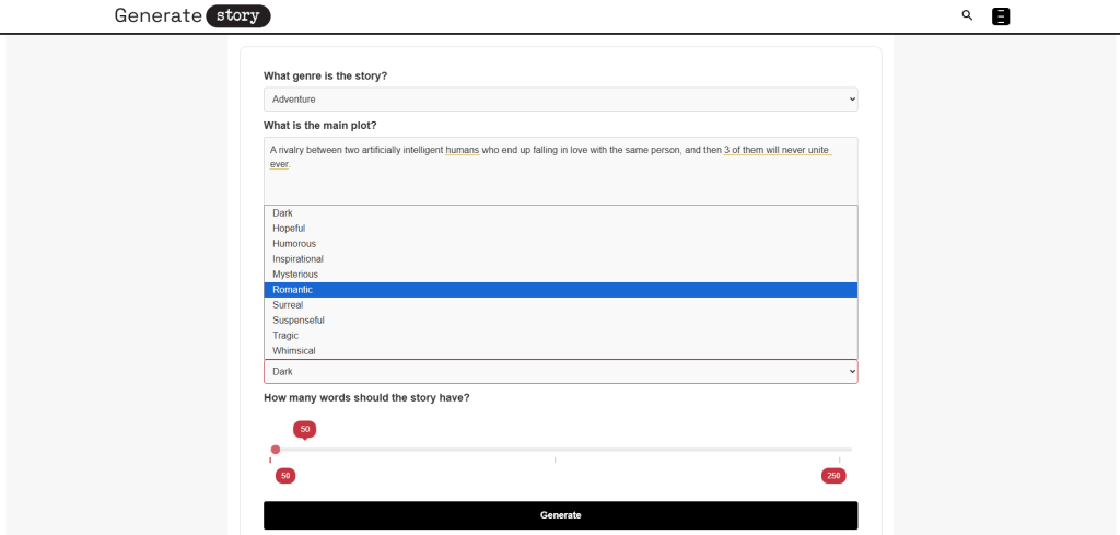 Select a Genre: Choose from genres like Sci-fi, Romance, Mystery, Fantasy, Thriller, Horror, Historical Fiction, Comedy, Adventure, or Drama. This choice sets the tone for your story.