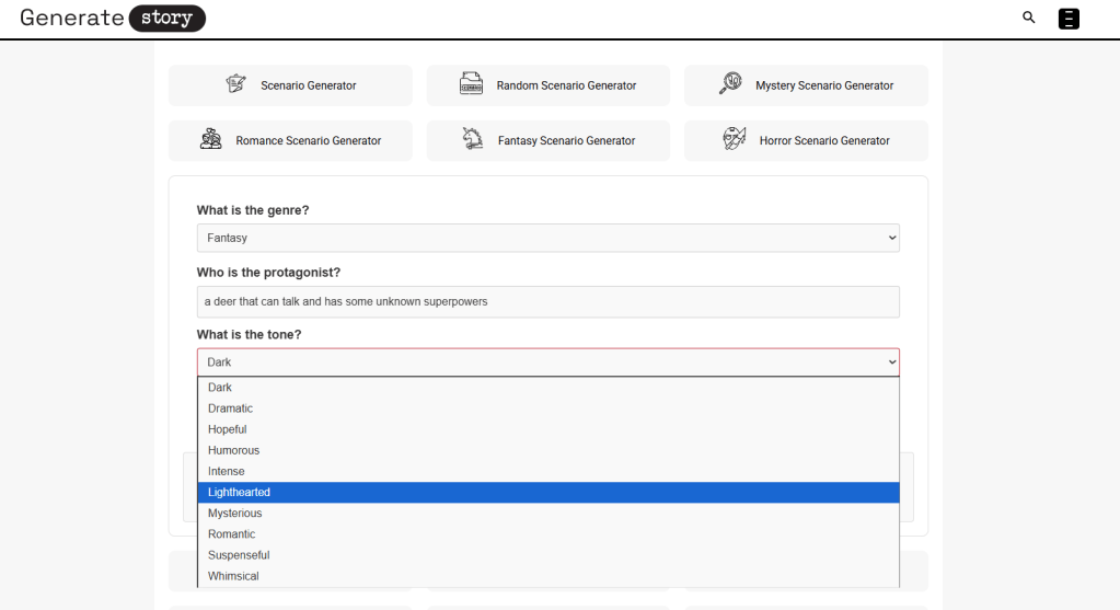 - Choose the Tone: Finally, select a tone from the provided options. Whether it’s Suspenseful, Lighthearted, Dark, or any of the other choices, the tone will guide how the narrative unfolds.