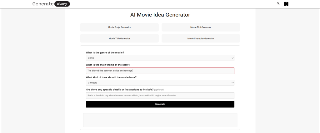 1. Select the Genre: The first step is to choose the genre of your movie from a dropdown menu. You have options like Action, Comedy, Drama, Horror, and many more. For example, if you select “Thriller,” the generator will cater the ideas to that specific genre.