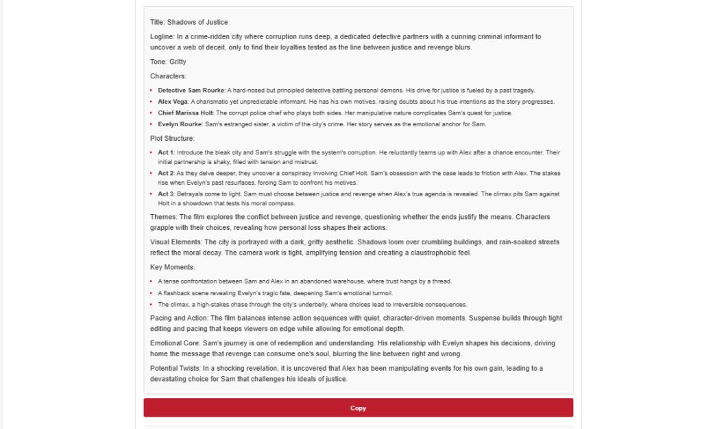 3. Choose the Tone: After specifying the theme, choose a tone for your film. Options include Light-hearted, Dark, Suspenseful, and more. If you say “Suspenseful,” the output will reflect a thrilling atmosphere, fitting for a good mystery.