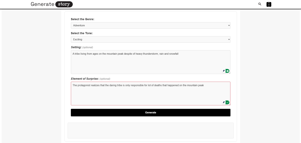 - Lastly, in the Element of Surprise field, input a unique twist that could change the course of your story. For instance, “The protagonist discovers they are responsible for mysterious deaths but can’t recall their actions due to memory loss.” This adds an intriguing layer to your plot.