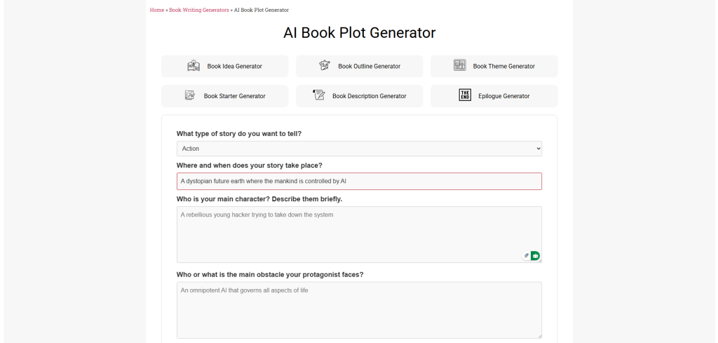 Using this book plot generator is simple and direct. You just provide a few key details, and it helps you outline your story’s core. Here is how you can use it: