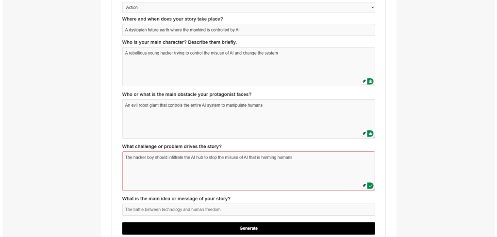 - First, you tell the generator what kind of story you want to write. You pick from options such as Fiction, Science Fiction, or Fantasy. Example: Fantasy, Fiction, Narrative, etc.