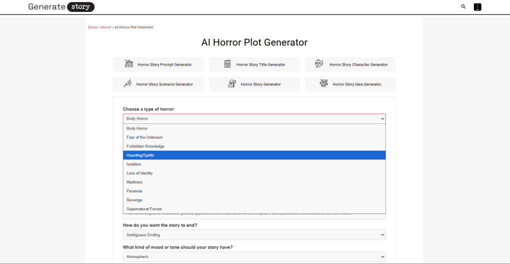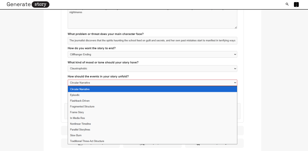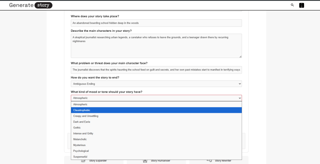 - Choose the mood or tone of the story from choices like “Suspenseful,” “Dark and Eerie,” or “Psychological.”