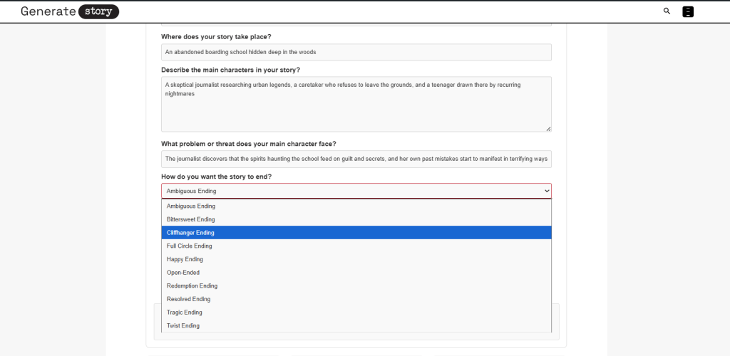 Your ending choice determines the story’s resolution type, from resolved conclusions to ambiguous finishes. This selection guides the generator in building toward your preferred outcome while maintaining horror consistency. The tool ensures your chosen ending type aligns with the established horror elements and character arcs throughout the plot.