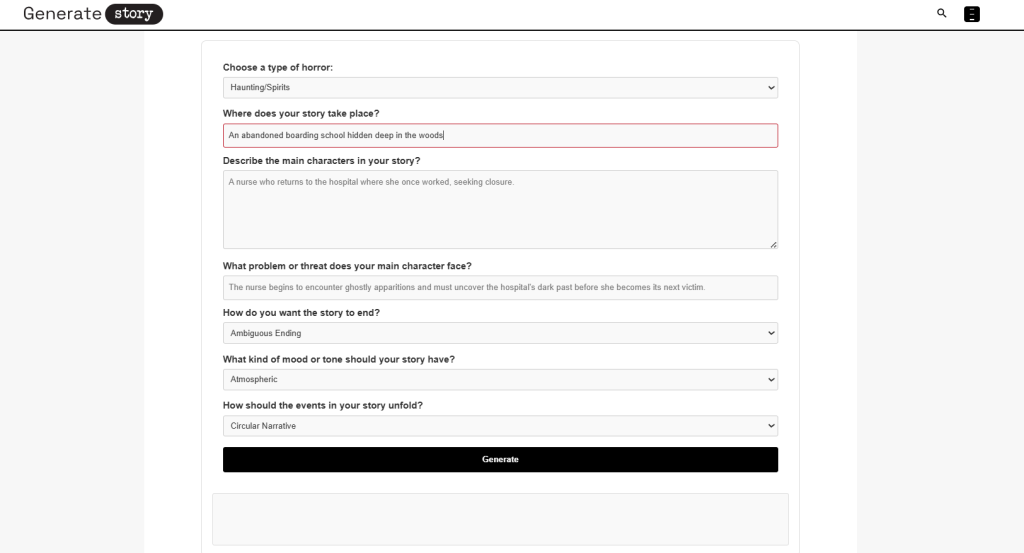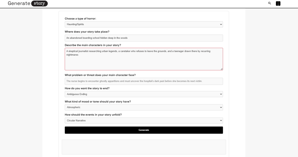 The character description textarea lets you outline your main characters’ roles and relationships. This input helps the generator create character-driven horror where personal fears and relationships contribute to the tension. You might describe a protagonist’s background or vulnerabilities, which the AI uses to develop horror elements that specifically target those weaknesses.