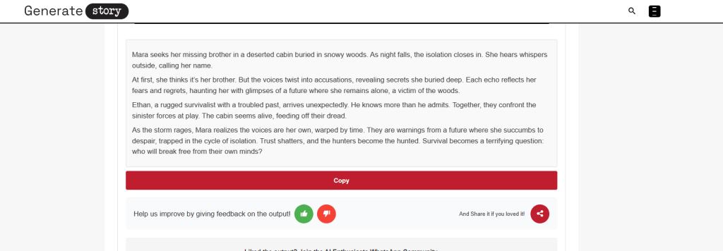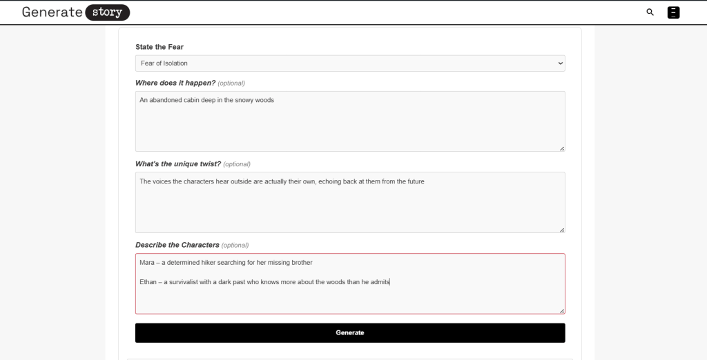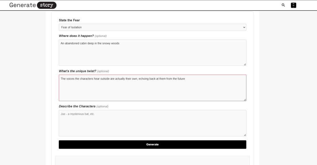 This optional field allows you to introduce unexpected elements to your horror concept. You might specify “the monster is actually a metaphor for grief” or “the protagonist is the real threat.” The generator incorporates these twists while maintaining the story’s internal logic. For more twist inspiration, you can also use a dedicated plot twist generator to develop surprising narrative turns.