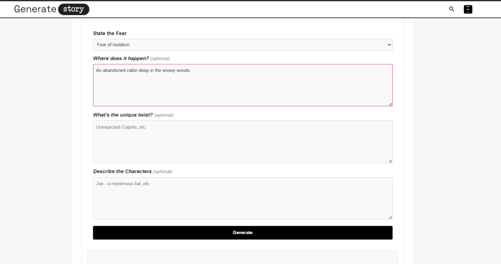 The optional location field lets you specify where your horror story unfolds. You can describe settings like “abandoned asylum,” “remote research station,” or “suburban neighborhood.” If you leave this blank, the AI will generate an appropriate setting based on your chosen fear type. This works well with our story setting generator if you need more detailed environmental descriptions for your horror narrative.