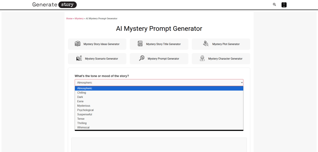 - Once there, you will find a field labeled “What’s the tone or mood of the story?” You’ll see a dropdown menu. You can choose from options like “Suspenseful,” “Dark,” “Eerie,” or “Whimsical.” Pick the one that best fits the feeling you want for your story. This choice helps the tool understand the atmosphere you are aiming for.