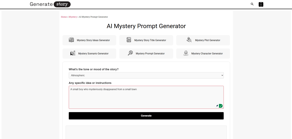 - Next, you will see a text area labeled “Any specific idea or instructions.” This is where you can add any specific details you have in mind. For example, you might type “A mysterious disappearance in a small town” or “A detective finds a strange clue at an old mansion.” Even a small detail here can guide the creative mystery prompt generator.