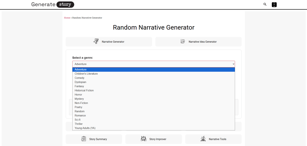 The Random Narrative Generator handles all included genres, but works differently for each. For poetry, it might generate thematic concepts and structural ideas rather than traditional narratives. For non-fiction, it focuses on factual storytelling approaches and informational structures. Each genre selection triggers different AI processing patterns tailored to that genre's conventions.